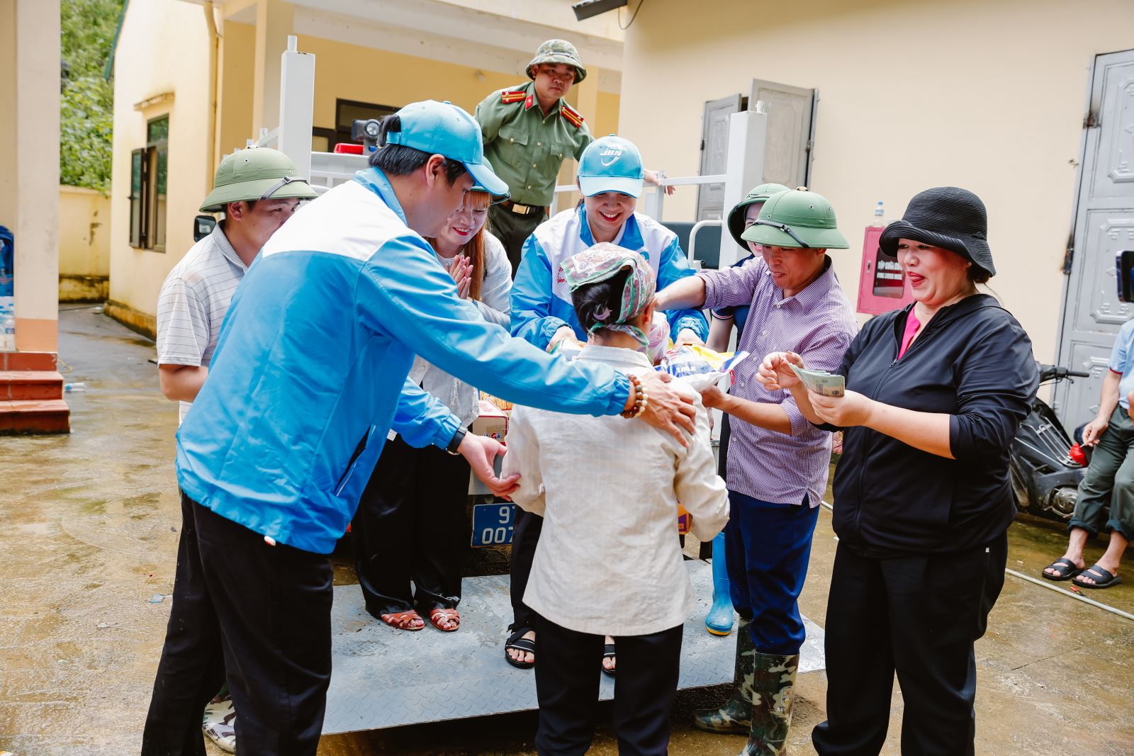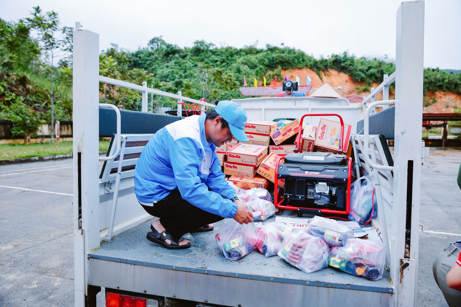 Trên những con đường lầy lội sau mưa, từng bao gạo, thùng mì, chai nước mắm… được chuyền tay nhau, như những sợi dây gắn kết tình người. Mỗi phần quà gồm: gạo, mì tôm, lạp xưởng, lương khô, nước tương, nước mắm, bánh trung thu, cá khô, dầu tràm và 1 triệu đồng tiền mặt.